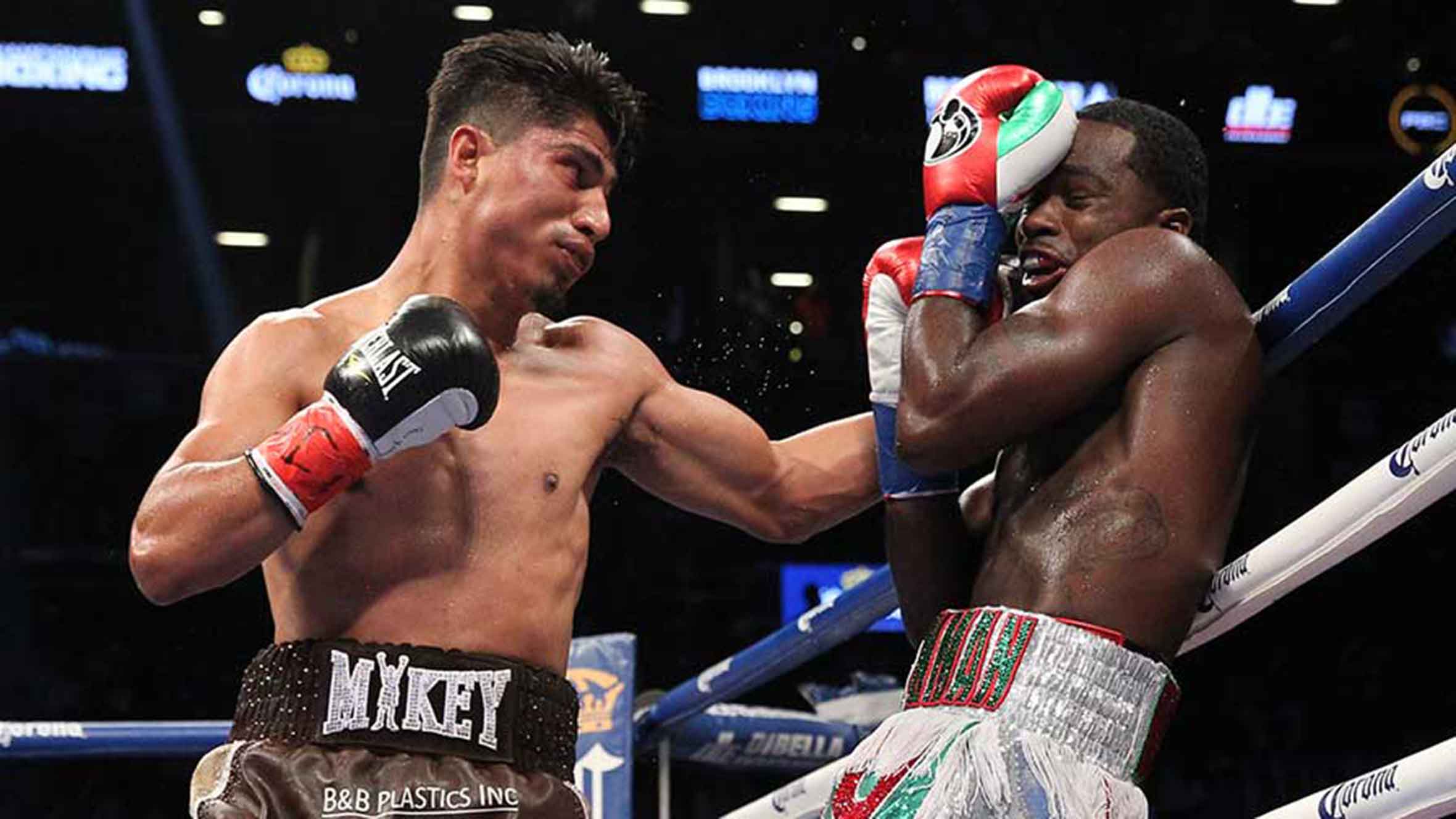 Powering up Mikey Garcia throws a right hand as Adrien Broner covers up during their 140-pound bout at Barclays Center in Brooklyn, New York. (Ed Diller/DiBella Entertainment)